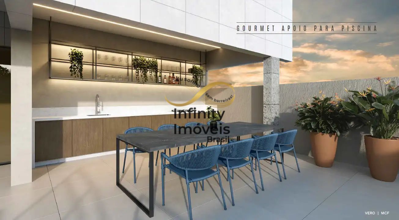 Área de lazer com espaço fitness, piscina com praia, salão de festas, playground e 2 áreas gourmet.